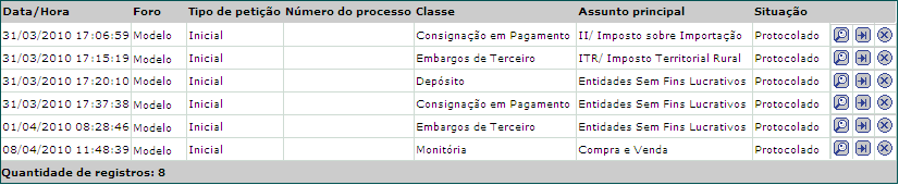 O resultado da consulta é apresentado logo abaixo dos parâmetros de pesquisa. Para cada petição são apresentados data e hora de envio ou salvamento, foro, tipo de petição, número do processo (para petições intermediárias), classe, assunto principal e situação.
